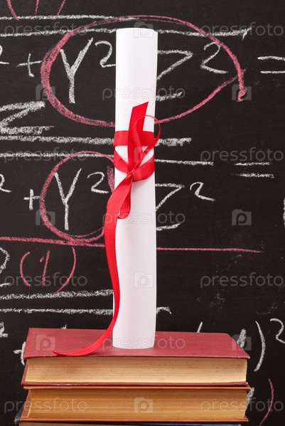 Диплом и стопка книг на фоне классной доски