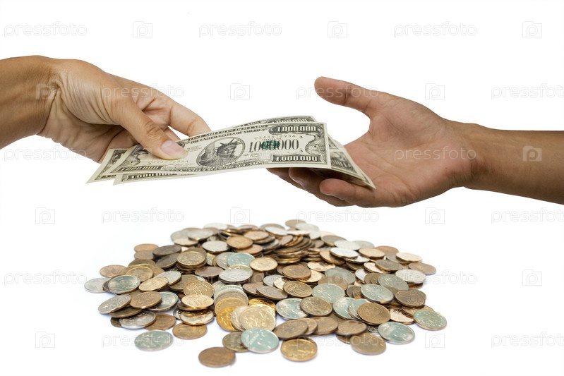 Гора монет и бумажные купюры в руке
