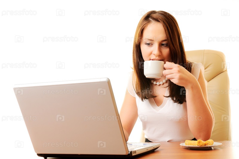 Девушка за ноутбуком пьет кофе