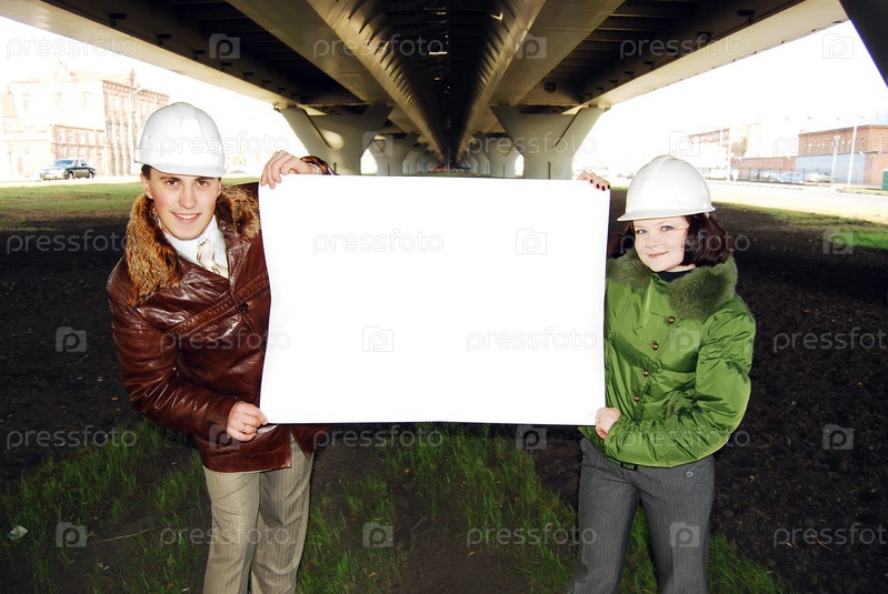 Парень с девушкой в касках держат белый ватман