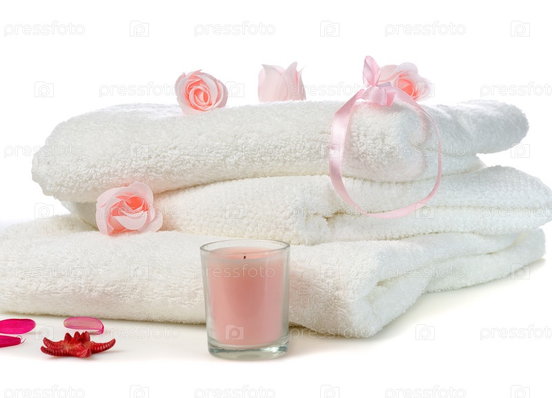 Белые полотенца с розовым мылом в форме роз и свечей