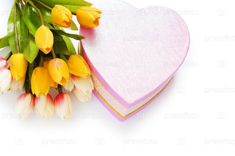 Букет тюльпанов и подарочная коробка в форме сердца