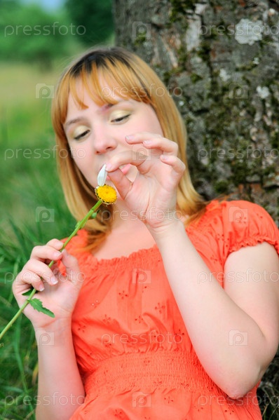 Молодая женщина, сидящая возле дерева с ромашкой в руках