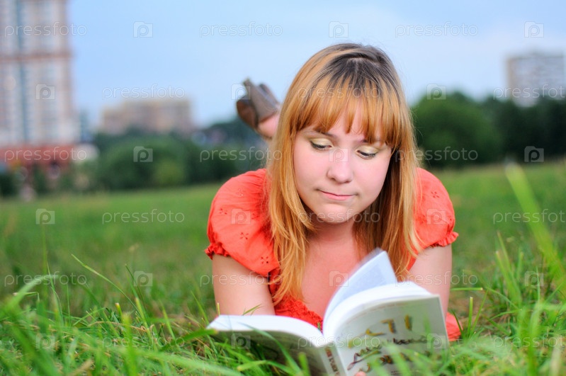 Молодая женщина лежит на траве и читает книгу