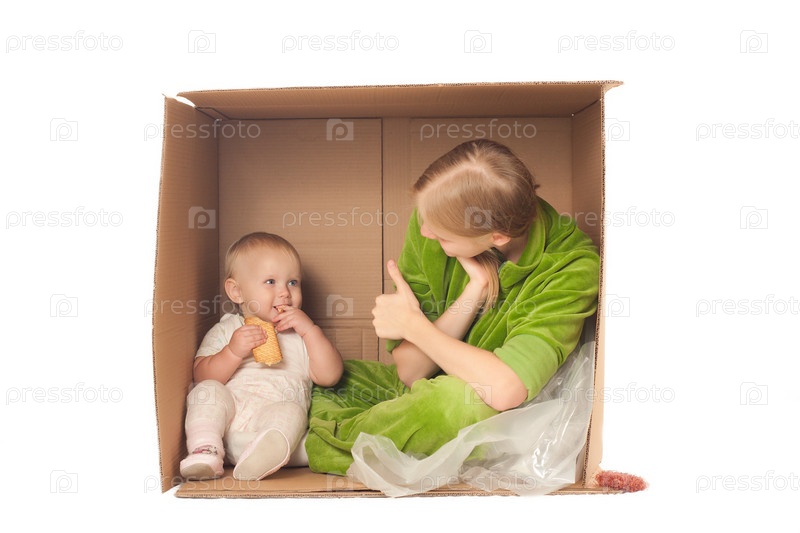 Молодая мама и ребенок сидят в коробке