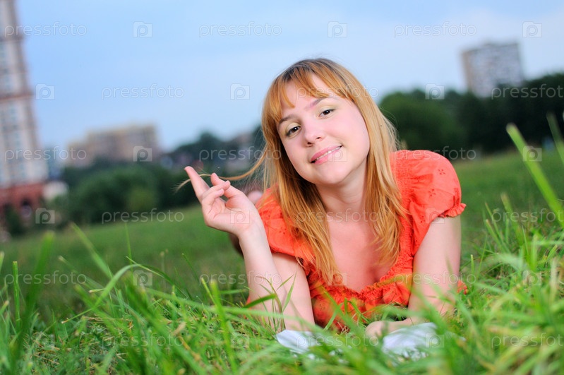 Молодая девушка лежит на траве