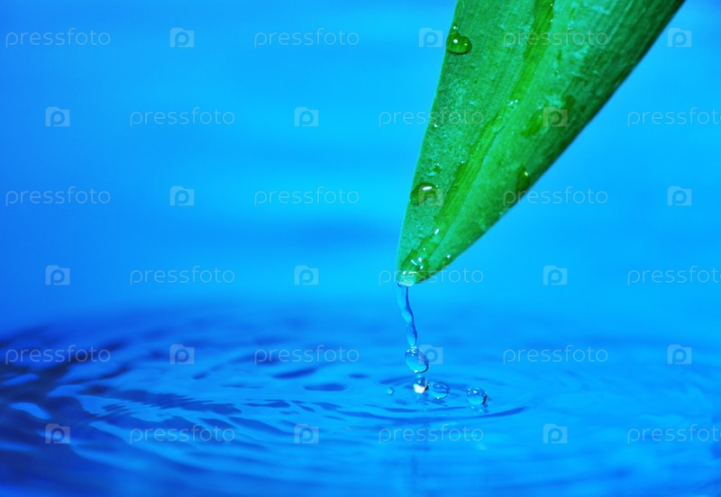С кончика зеленого листа капает вода