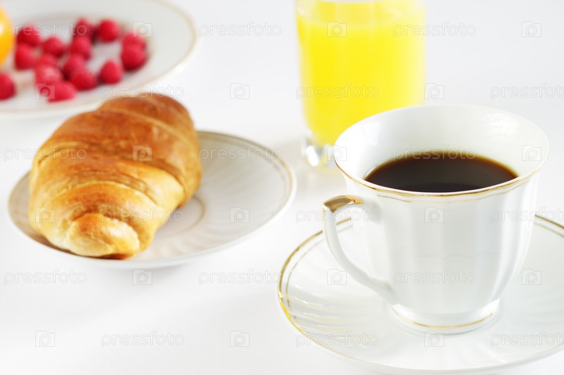 Чашка с кофе, булочка, сок апельсиновый и ягоды