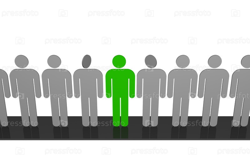 Несколько человеческих фигур серого цвета и одна зеленая посреди них