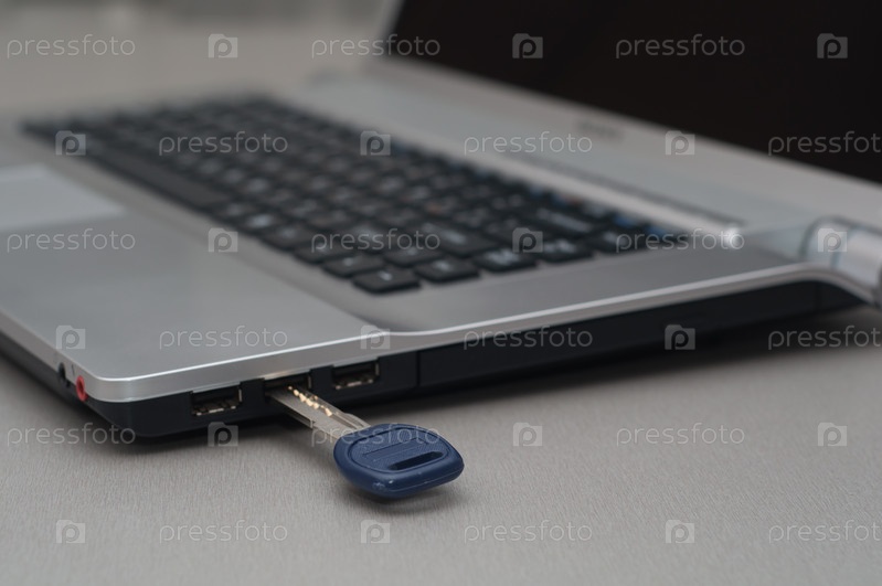 Ключ в ноутбуке на сером фоне