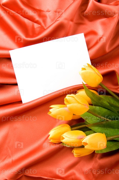 Букет тюльпанов и конверт на красном фоне
