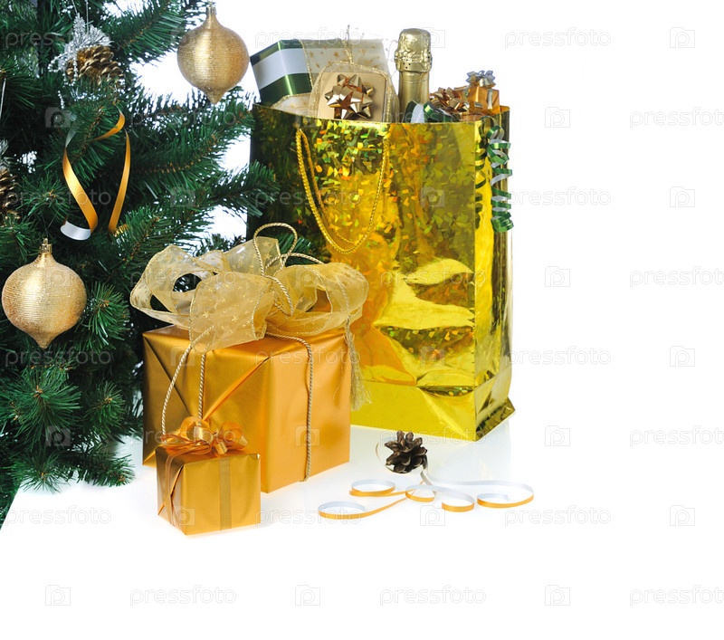 Подарки под елкой на белом фоне