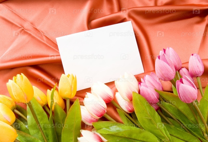 Букет тюльпанов и конверт на красном фоне