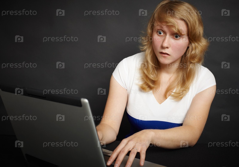 Удивленная блондинка напротив ноутбука на сером фоне