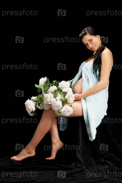 Беременная женщина с букетом белых роз