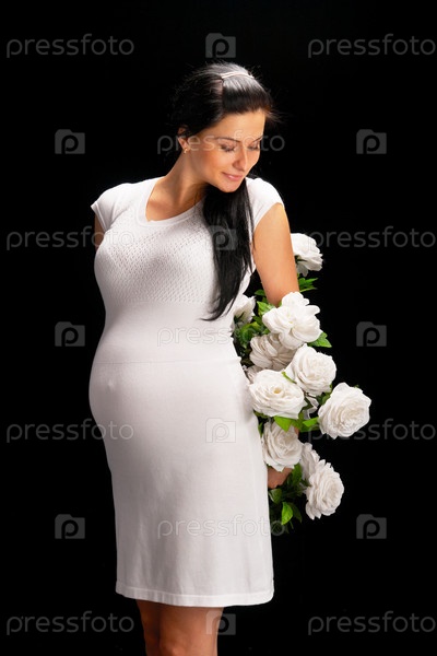 Беременная женщина с букетом белых роз