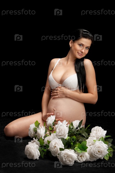 Беременная женщина с букетом белых роз