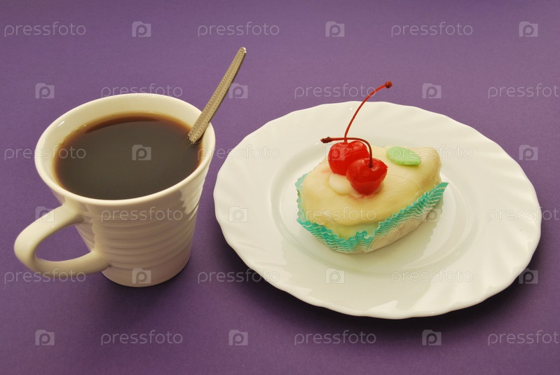 Чашка кофе и пирожное на тарелке