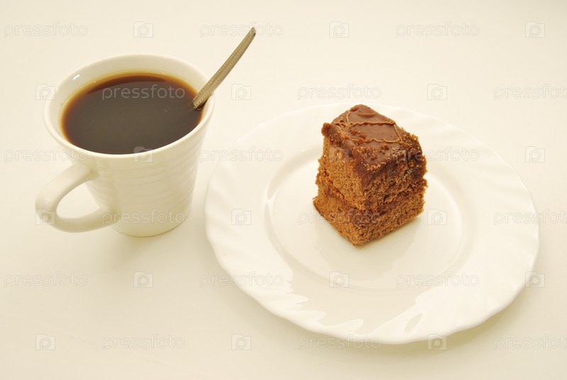 Чашка кофе и кусочек шоколадного пирожного на тарелке