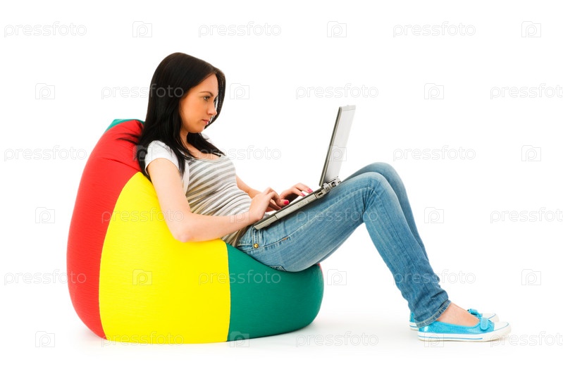 Девушка, работающая на ноутбуке на белом фоне