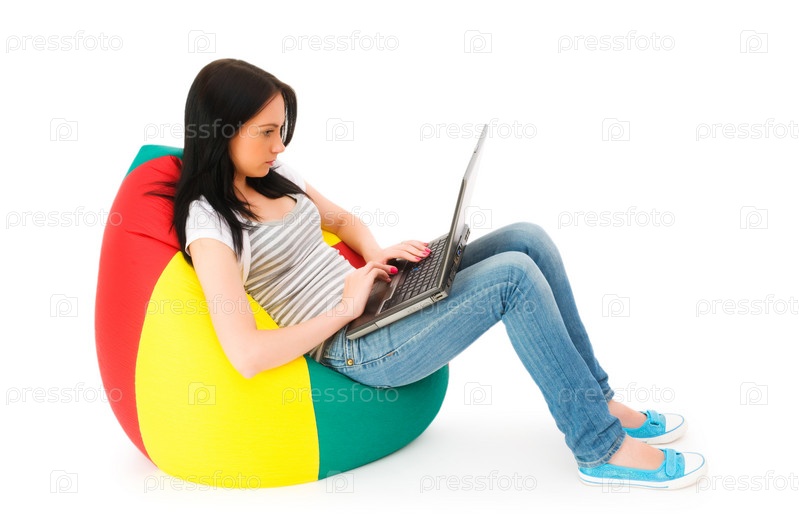 Девушка, работающая на ноутбуке на белом фоне