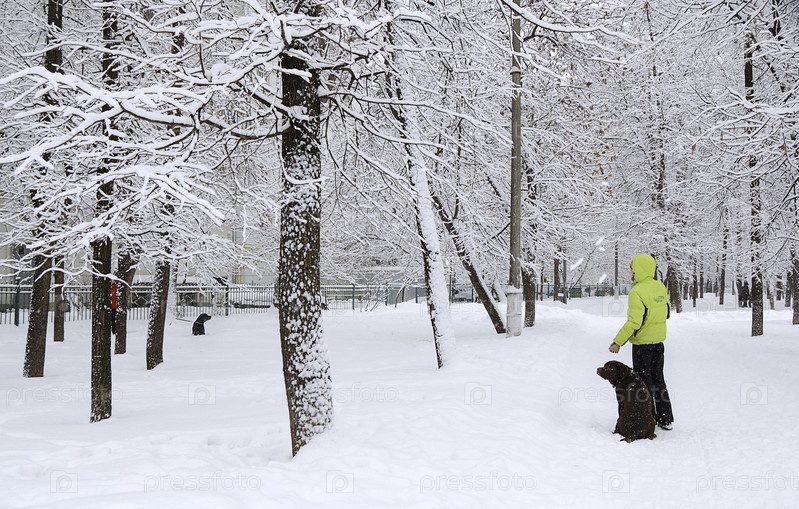 Люди выгуливают собак в парке зимой