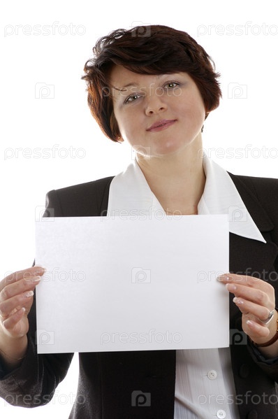 Взрослая женщина держит чистый лист бумаги