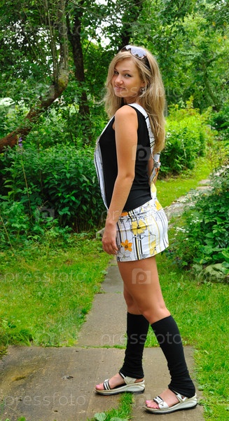 Молодая блондинка в летнем саду