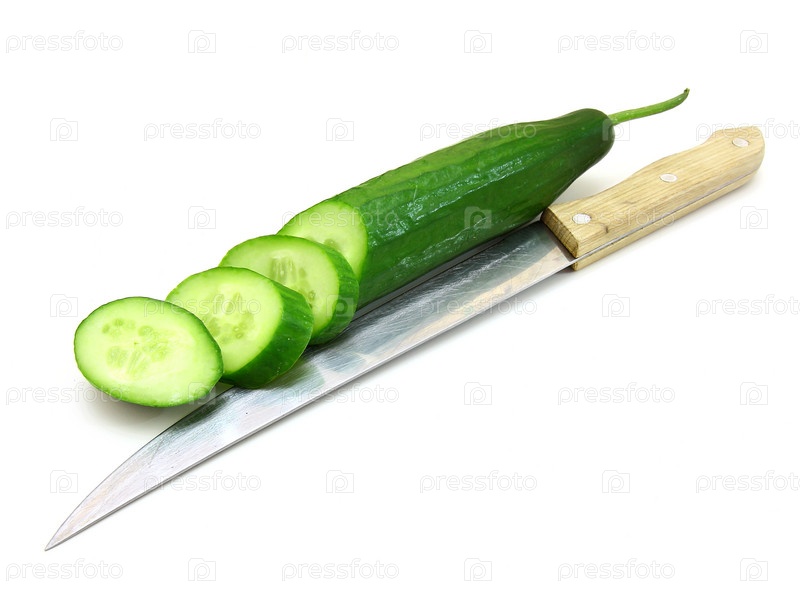 Свежий огурец и острый нож на белом фоне