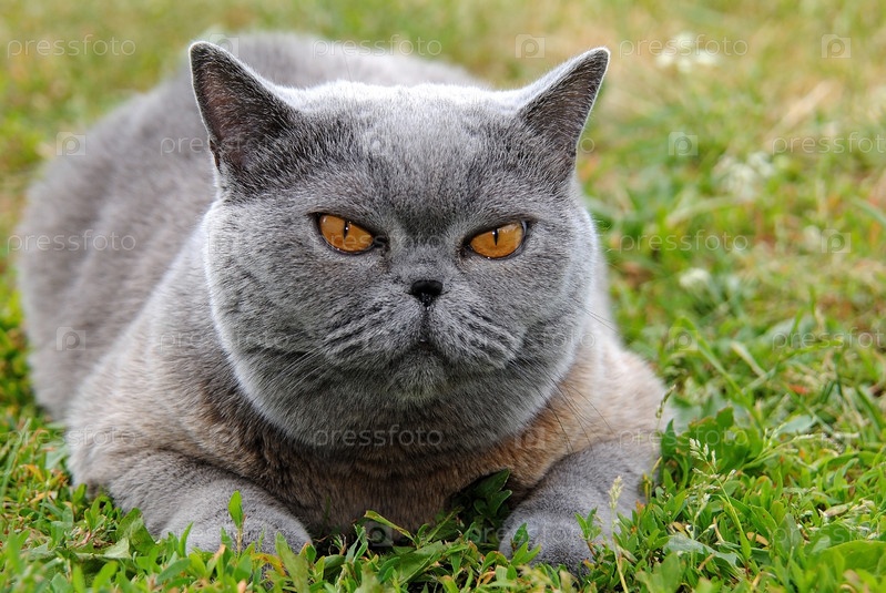 Серый кот с коричневыми глазами лежит на траве крупным планом