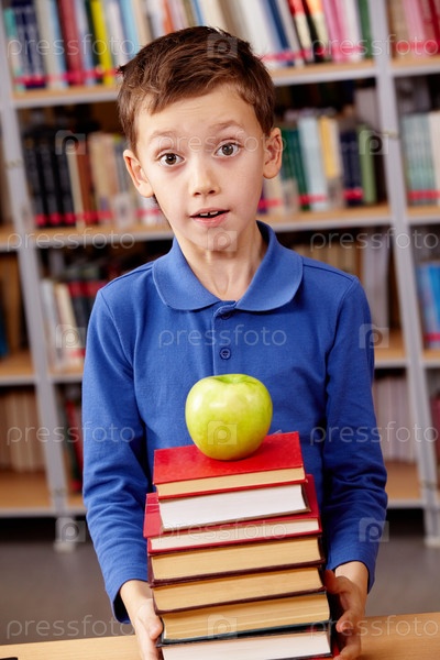 Портрет школьника со стопкой книг и яблоком в библиотеке