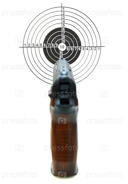 Пистолет напротив мишени на белом фоне