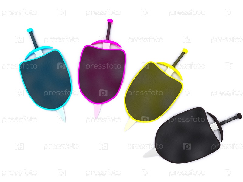 Разноцветные мечи со щитами на белом фоне, 3D