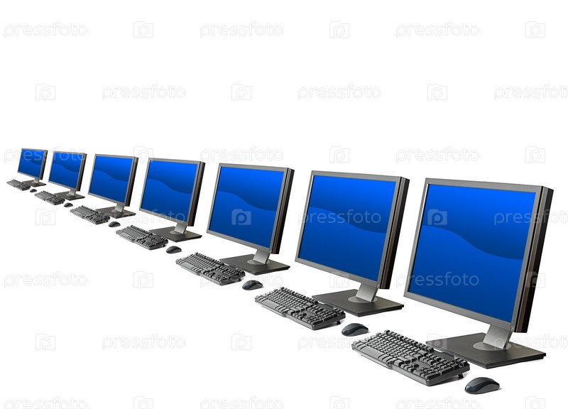 Мониторы с клавиатурами и мышками выставлены в ряд на белом фоне