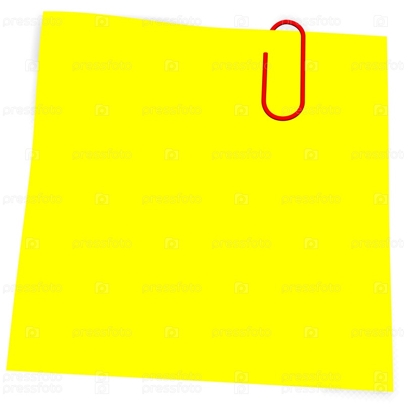 Желтый листок бумаги со скрепкой крупным планом на белом фоне