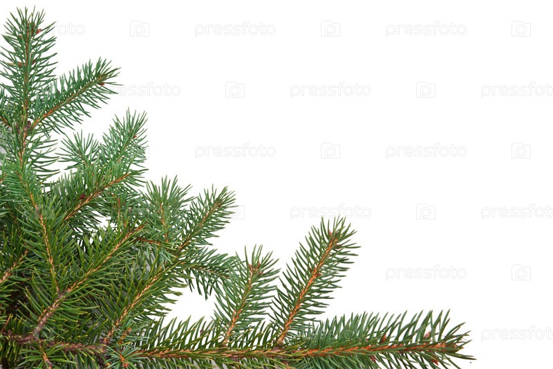 Елочная ветка крупным планом на белом фоне