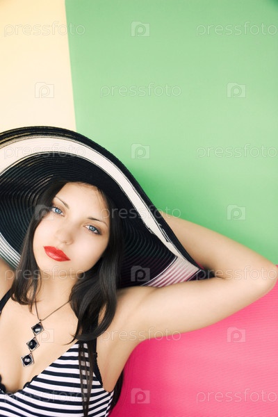 Красивая девушка в шляпе на цветном фоне