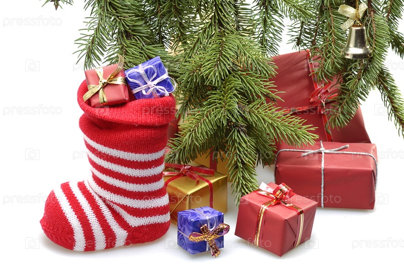 Чулок с подарками на фоне елки