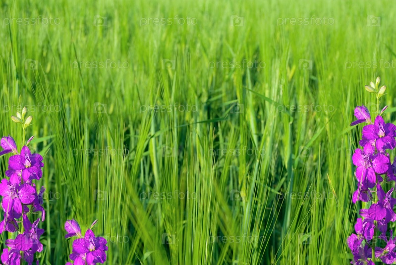 Зеленое поле молодой пшеницы с фиолетовыми цветами