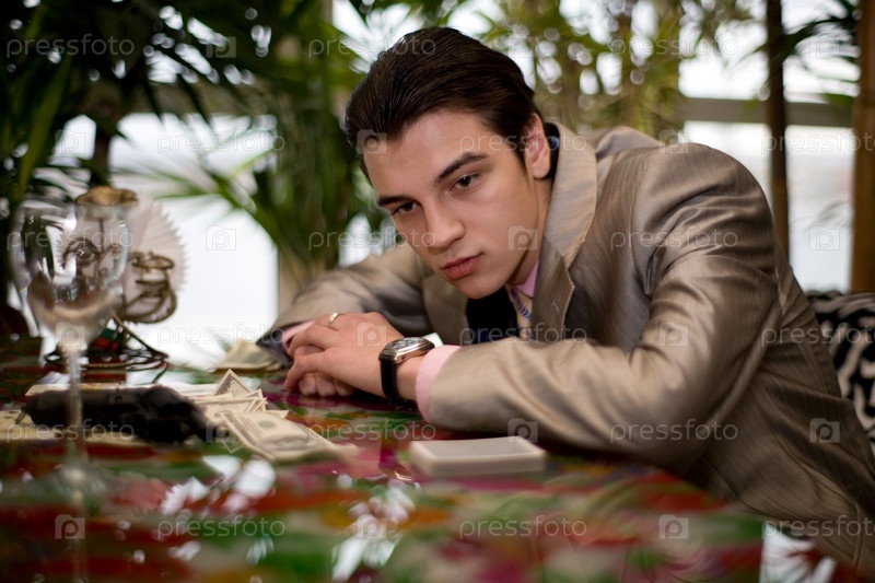 Молодой человек сидит за столом с картами, долларами и пистолетом