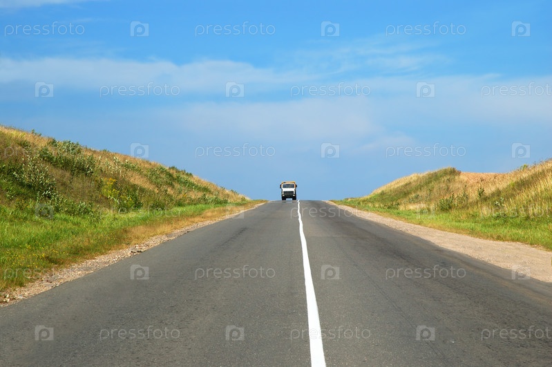 Сельское шоссе с грузовиком. летний облачный пейзаж