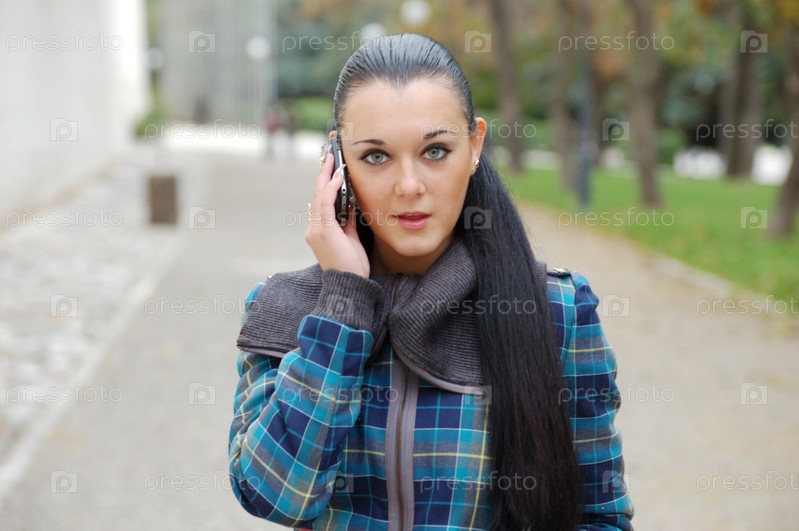Молодая симпатичная брюнетка разговаривает по телефону на улице