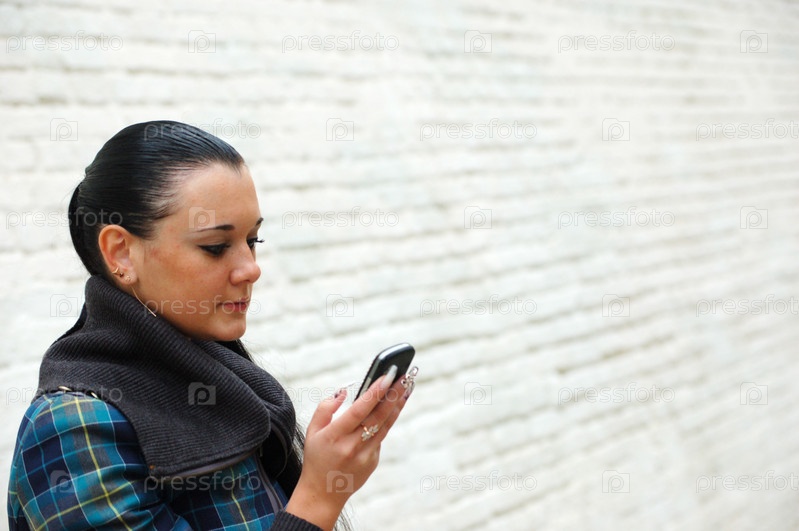 Молодая симпатичная брюнетка с телефоном на фоне кирпичной стены