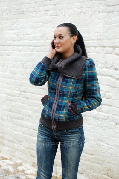 Молодая симпатичная черноволосая девушка на фоне кирпичной стены