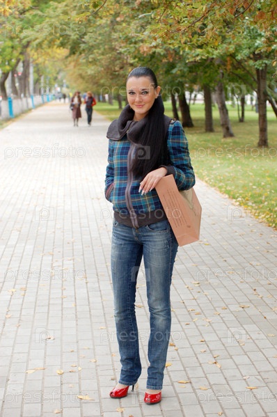 Девушка стоит на тротуарной дорожке в парке