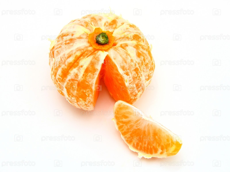 Очищенный мандарин и долька мандарина на белом фоне