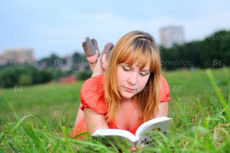 Молодая женщина лежит на траве и читает книгу