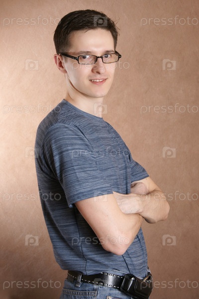 Портрет молодого человека в очках на фоне коричневой стены