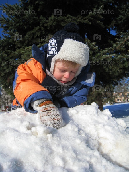 Маленький мальчик играет в снегу в парке