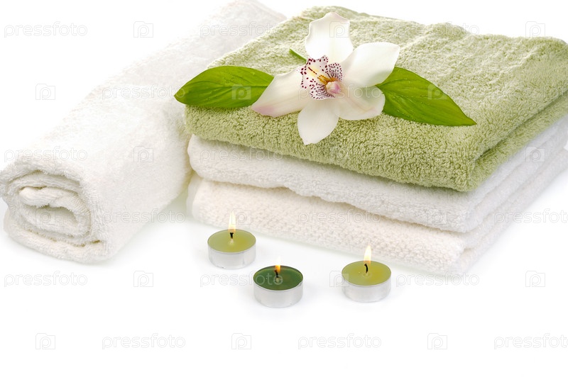 Орхидея, лежащая на полотенцах, рядом с горящими свечками. Спа-процедуры